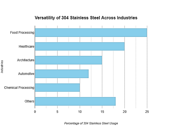 Yes, you can rely on this type of stainless steel because it is known for its excellent corrosion resistance, durability, and versatility. All these properties come from its composition i.e. Iron, Chromium, Nickel and other alloying elements. It is used from kitchen accessories to architectural structures. Its ability to resist and withstand in corrosive environments and maintain its integrity makes it reliable choice in many industries. So yeah, 304 stainless steel is a good quality type of stainless steel. Following graph shows its versatility in different industries which shows it’s a good quality and reliable type of stainless steel: