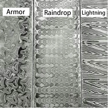 Damascus steel knife is different based on its pattern. Common types are twist, ladder, raindrop. Wild, mosaic, herringbone. These patterns are depending on the integrity of steel structure, improving functional and aesthetic quality of blade material.