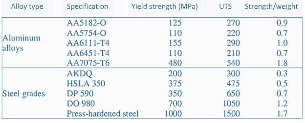 Engineers, architects and industrialists can utilize a metal strength to wait ratio chart for selection of the best material. In aerospace industrial, materials providing high strength ratio are considered really important. The table below is comparing the aluminum and steel grades. Here, we can see that the aluminum alloys have the higher ratio value as compared to steel grades. That is the reason why aluminum alloys are more suited for aircrafts and automobile parts. Here, yield strength and ultimate tensile strength are also given along with the ratios.