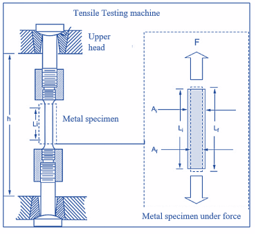 It is the measure of material performance under tension. It is basically the maximum load that a metal can bear when it is under tension. The schematic diagram given below shows how tensile testing is done by placing the metal specimen in universal testing machine (UTM).