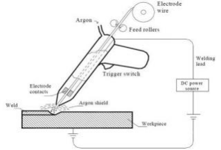 This welding process consists of Electric source, Consumable feed wire roll, Argon or carbon dioxide shielding gasses to prevent molten pool. Electric supply creates voltage difference between workpiece and metallic part to produce arc between them. In the parallel shielding gas and electrode wire comes to workpiece. Figure..No. 1 shows MIG welding diagram.