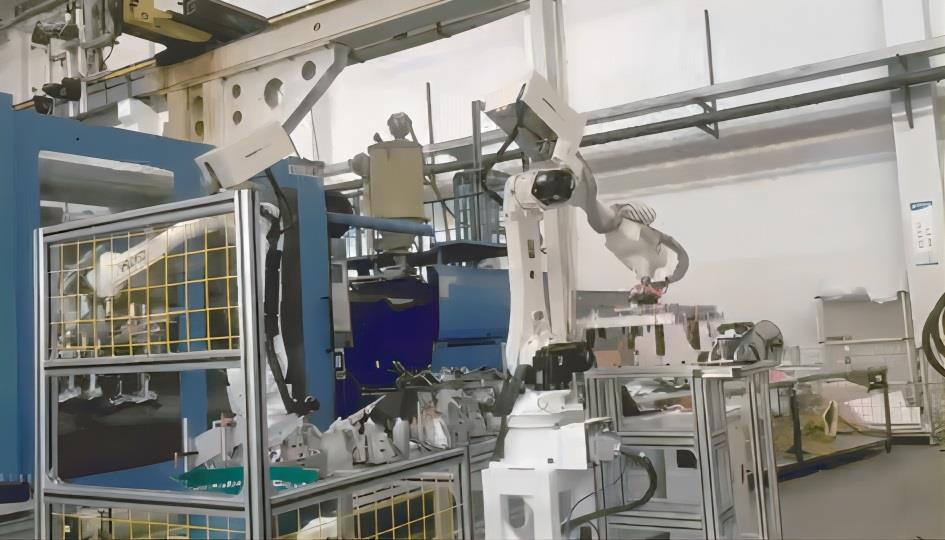 After the injection molding machine is finished, the part will be taken out by the truss manipulator, and the 1# robot will take over the two injected parts from the truss manipulator and put them on the two workbenches A and B respectively. The material completion signal is given to the 2# robot, and the sponge can be placed. At the same time, after the 1# robot replaces the gripper, it goes to the vibrating plate to take the material level and takes the buckle.