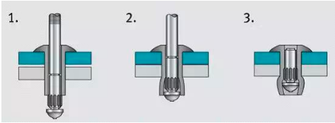 Blind rivets make single-sided operation a simpler and easier process. The working principle of blind rivets is realized by pulling the core head with a force from the inside to the outside with the help of a rivet gun.