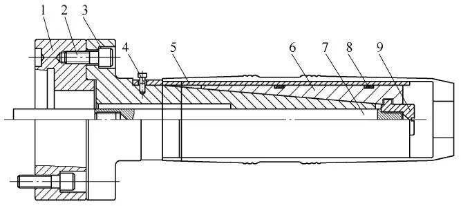 As shown in Figure 1-23, the two-layer wrapping clamp includes a first flange 1, a screw 2, a first clamping body 3, a screw 4, an expansion shoe 5, an expansion block 6, a first pull core 7, and an expansion ring 8 and the first baffle 9.