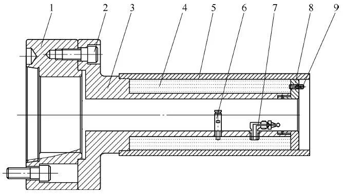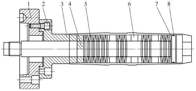 1—Second flange 2—Screw 3—Second clamping body 4—Second pull center 5—Disc spring 6—Protective sleeve 7—Second baffle 8—Sealing ring