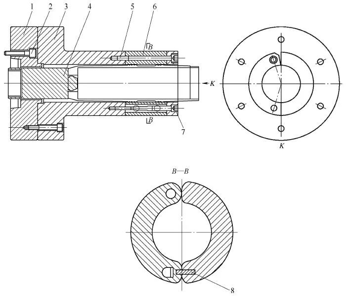 As shown in Figure 1-26, the semi-open clamp includes a fourth flange 1, screws 2, a fourth clamping body 3, a positioner 4, a rotating shaft 5, a press cover 6, a locking shaft 7, and a spring 8.