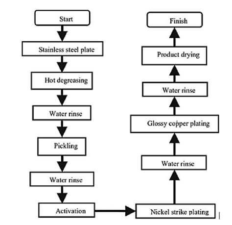 Electroplating start by sample preparation suppose you want to metallic plating of copper on stain less steel first we have to do hot degreasing. Then rinse the surface with a lot of water and dried. Next step in this metal plating technique is to activate surface for this we dip the solution in nickel salt containing solution so that the nickel ion absorbed on the surface activating it for zin coating. After that electrode is attached to negative terminal in electrolytic cell for electroplating. Select parameter according to desired thickness of the coating. After rinsing it with water to remove electrolyte residue again next electroplating set up is arranged for copper coating. Again, parameters of electroplating are set up according to thickness of the coating. After that again wash it thoroughly and dry. The smooth surface of electroplating is ready.