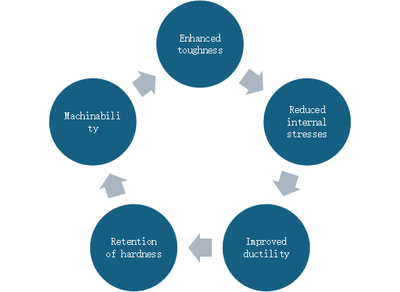 Reduces hardness and brittleness, increases toughness and ductility. |