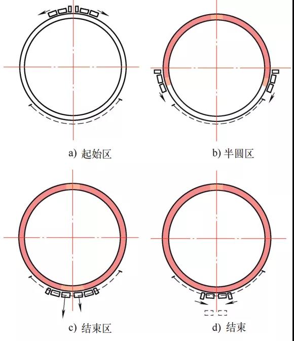 Figure 1 shows the location of the heating assembly in different stages of process. The heating begins at a point of the annular part, and the two heating components are close to each other. Figure 1a). At this stage, all the sensors are heated together. When the starting area reaches the temperature of the process extinction, the rotary platform stops swinging and the two independent heating components move in the opposite direction. At this time, the main sprayer opens and begins to quickly cool the surface of the starting area. When heated in stable scan mode, each heating assembly moves around half the circumference of the bearing (see Figure 1B). Adjust the scanning speed and heating power as a function of the process requirements to obtain the required hardened layer. The two heating assemblies move in the opposite direction of the rolling roll to a position opposed to the departure area, which is called the end zone. When the two heating assemblies are close to each other, the two pairs of preheating sensors are immediately adjacent to each other (see Figure 1c). Currently, the supply of the first preheating sensor of the heating assembly is interrupted and the preheating sensor is removed from the surface of the roller. The removal of a sensor creates a closer heating space for the two heating components. When the preheating sensor of the second heating assembly is adjacent to the heating sensor of the first heating assembly, the supply of the second preheating sensor is again extinguished while the inductor leaves the surface of the roller. The second preheating sensor covers the surface of the roller and is then heated by two heating sensors near each other (see Figure 1D). When the two heating sensors are closest to each other, the power is disabled and the platform platform is quickly moved so that one of the auxiliary showers covers the last section of heating roller. The constant gap between the inductance and the surface of the roller is the base to obtain a uniform heating mode.