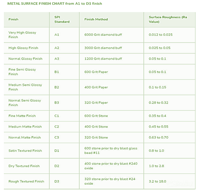 Tabela wykończeń tworzyw sztucznych przedstawia kontrast między różnymi wykończeniami, ich zakres chropowatości oraz koszt uzyskania pożądanej chropowatości. Następnie tworzywa sztuczne są porównywane pod kątem pożądanej chropowatości, na przykład najbardziej odpowiednim materiałem do powierzchni o wysokim połysku A1 (o minimalnej chropowatości) jest polimer akrylowy. Polipropylen i poliuretan nie nadają się do wykończenia powierzchni z połyskiem.