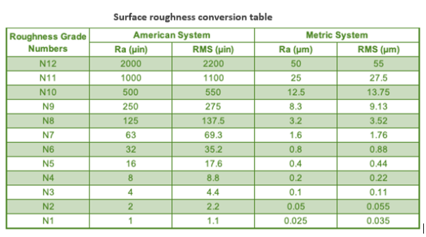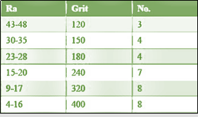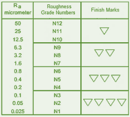 Tabela jakości wykończenia przedstawia zakres wykończenia powierzchni, od niepolerowanej do polerowanej (wysoko odblaskowej) oraz wartości chropowatości powierzchni w mikrometrach (µm) lub mikrocalach (µin). Czasami zawierają one obrazy powierzchni materiałów wykończeniowych. Poniższa tabela zawiera różne numery stopni i oznaczenia chropowatości.