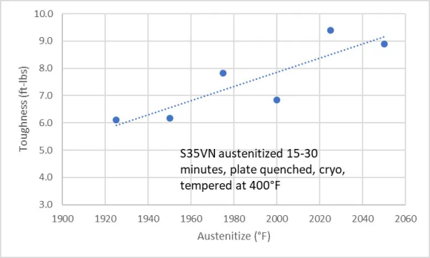 Toughness can be optimized in S35VN steel by controlling the austenitizing and tempering temperatures. freezing procedures can increase toughness and hardness in S35VN knife steel.